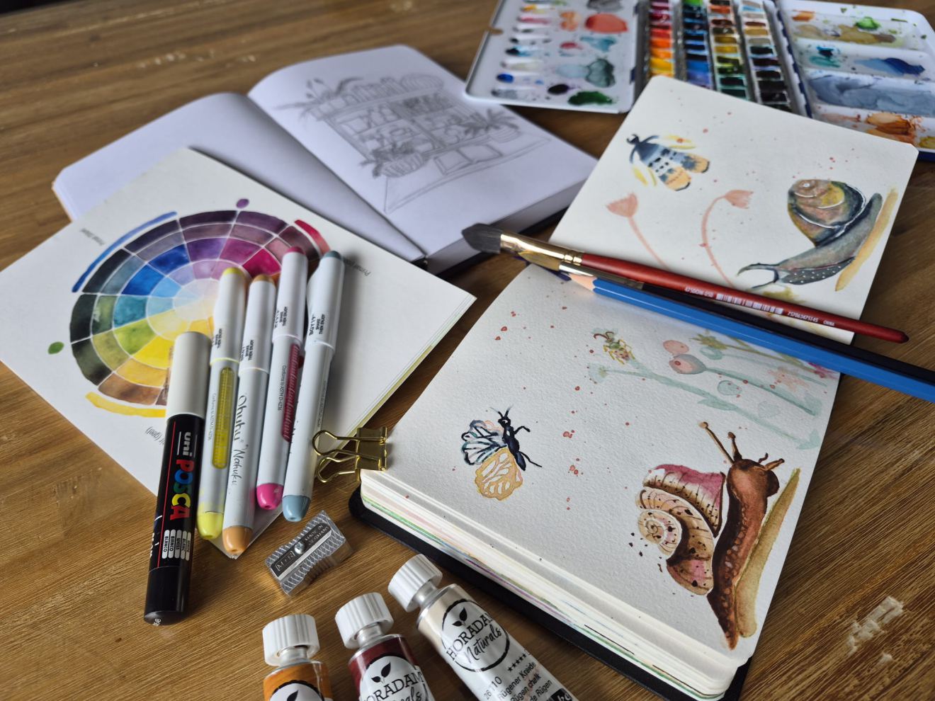 We kunnen aan de slag met schilderen met aquarel, acrylmarkers of waxpastel. Maar ook kan ik je leren hoe je eenvoudige tekeningen maakt, het schetsen van je dag en hoe je dat allemaal samen verwerkt in een (vakantie) journal.